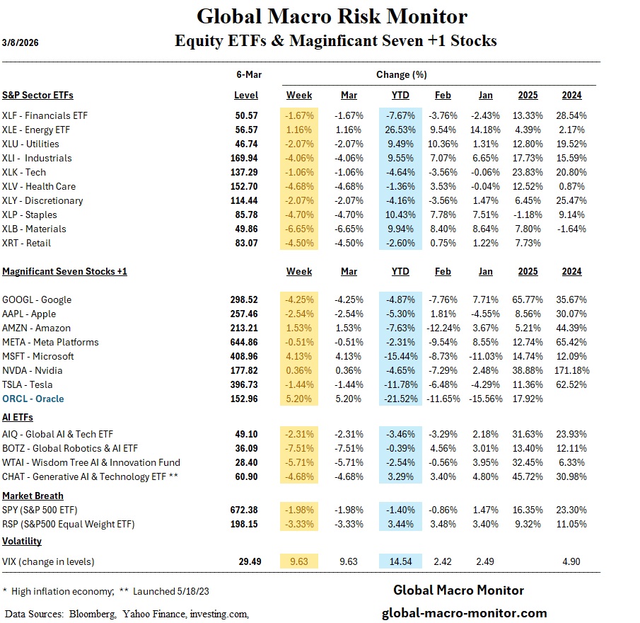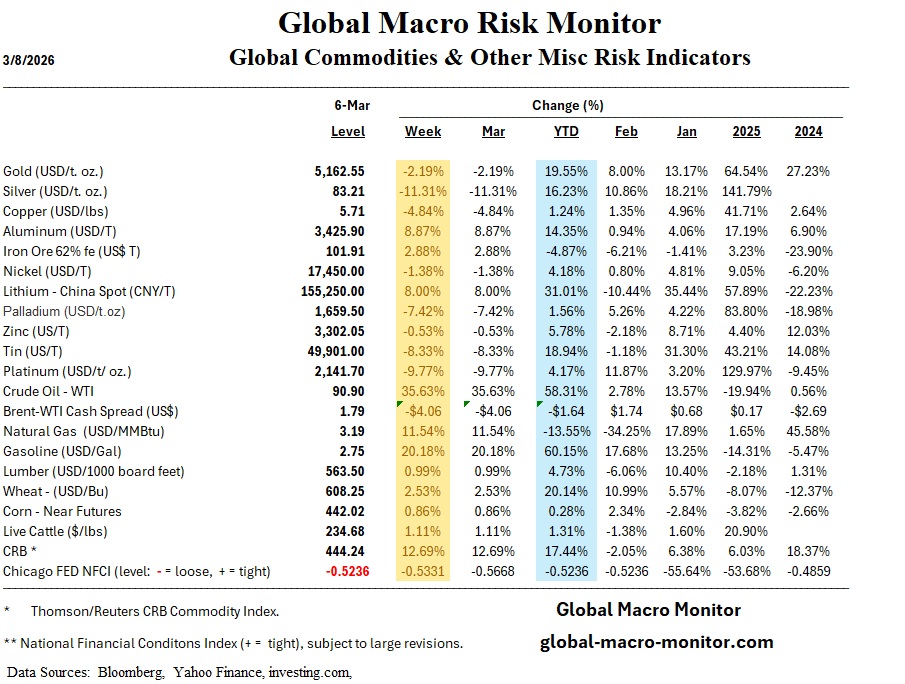 The global market narrative has been utterly hijacked by the seventh day of the U.S./Iran conflict. While Washington demands “unconditional surrender,” the energy markets are issuing a surrender of their own, to pure, unadulterated upward momentum. Crude oil prices surged a staggering 35% this week (and another almost $20 in Sunday night trading), have climbed approximately $40 in less than a fortnight, with WTI crude breaking above $108 per barrel. Despite this parabolic spike and the very real threat of a prolonged closure of the Strait of Hormuz, a choke point for one-fifth of global oil consumption, the S&P 500 remains down a mere 1.5% for the year. This disconnect is, frankly, staggering. Our view is that U.S. equities are currently a “screaming short,” though we’d advise keeping your hand firmly on the rip cord given the market’s irrational resilience.