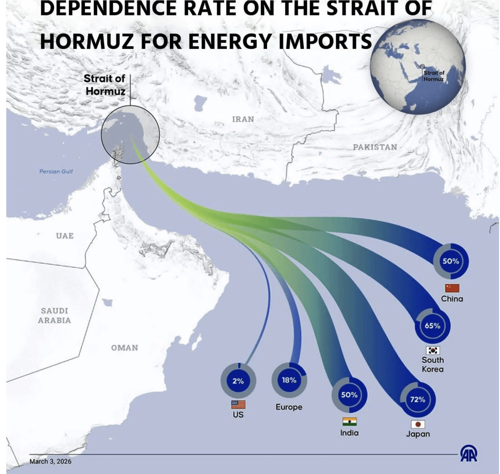 Up to 10–20% of global oil flows are at risk through Hormuz