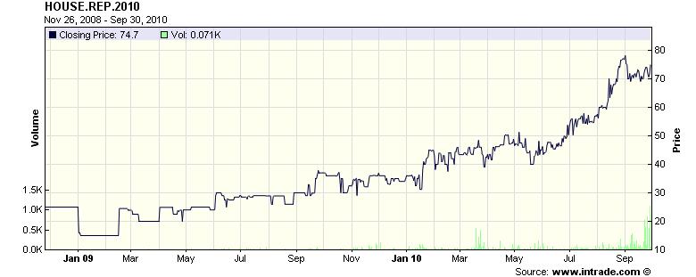 We’ve commented that an off-radar risk to gold is the hard money inclinations of the Republican leadership. A Republican House in the next Congress is a done deal according to the prediction markets. Intrade gives the scenario a 75 percent probability.