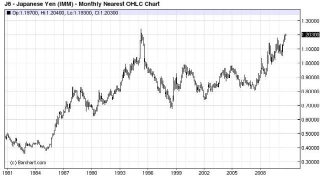 Take a look at a 30-year chart of the Yen to see if Japan is trying to weaken its currency in a “beggar thy neighbor” policy. The Yen has appreciated 50% against the dollar since 2007 and is at an all-time high in nominal terms and stronger in real terms. As mentioned in our earlier post, Japan is not engaged in a currency war, but a sandbagging mission to prevent the Tsunami of Dollars from flooding its economy, particularly the export sector.