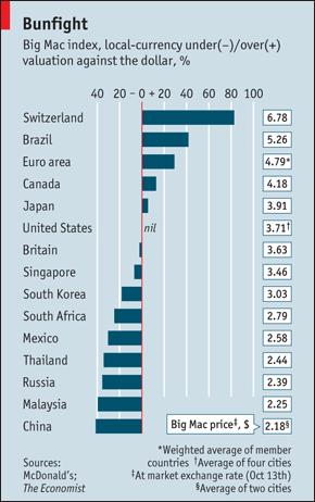 The tensions caused by such misalignments prompted Brazil’s finance minister, Guido Mantega, to complain last month that his country was a potential casualty of a “currency war”. Perhaps it was something he ate. In Brazil a Big Mac costs the equivalent of $5.26, implying that the real is now overvalued by 42%. The index also suggests that the euro is overvalued by about 29%. And the Swiss, who avoid most wars, are in the thick of this one. Their franc is the most expensive currency on our list..