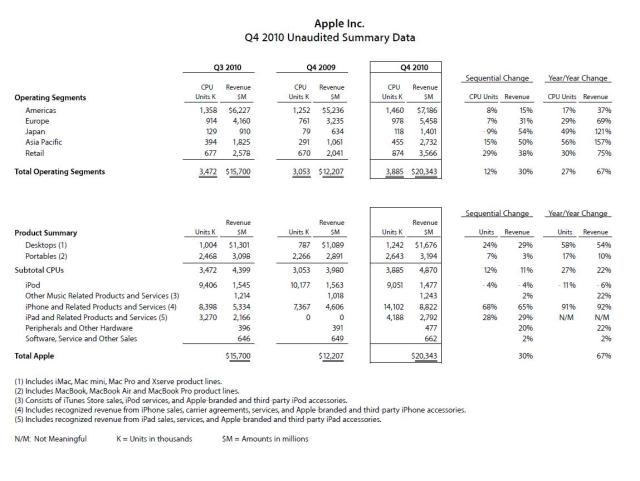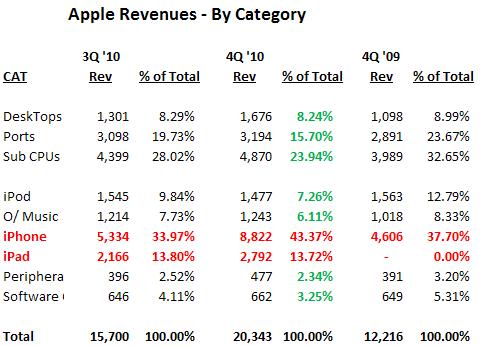 We found a couple of interesting nuggets in the earnings release. First, the IPhone and IPad were 57% of total revenues compared to the IPhone’s 38% in 4Q2009. Both are lower margin products, which may cause some concern. Second, Asia Pacific is now 13.4% of revenues compared to 8.7% a year earlier. The America’s revenue share fell to 35.3% from 42.9%. We’ll have more to say later in the week. Stay tuned!