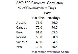 A good friend in Singapore, who is one smart dude, and former head of Goldman Sachs’ Asia asset management, pointed out the S&P500 trades almost tick for tick with the Euro and the Aussie currencies. This is reflected in the table showing the Australian Dollar and S&P500 have moved together a stunning 73% of the past 100 days and 76% of the last 200 trading days. The Euro is somewhat less correlated and Japanese Yen moves inversely with S&P500 65 percent of the trading days.