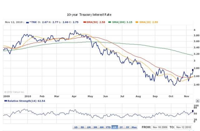 We’ve posted several pieces on the Treasury market about the bond’s positive technicals versus poor fundamentals. The 10-year rate is now close to piercing through key resistance at 2.83 percent. It is difficult to fundamentally determine why rates are moving higher: 1) a change in economic fundamentals — stronger growth, increase in inflationary expectations; 2) sovereign credit concerns spilling into U.S. markets; 3) reduced foreign capital flows into Treasuries; 4) Fed’s QE2 decision to focus on shorter maturities.