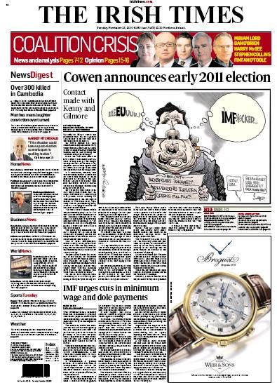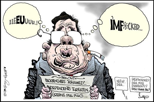 This cartoon of Prime Minister Brian Cowen is on the cover of today’s Irish Times. Pretty much sums up how the Irish feel. How long can the Euro last?