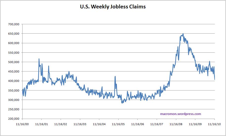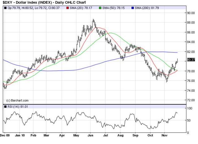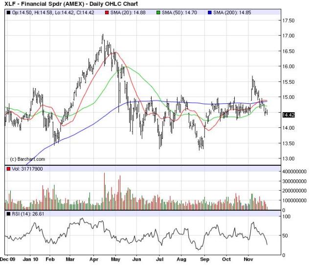 The slow improvement of the U.S. economy, reflected in weekly jobless claims, coupled with QE2 is providing an underlying bid to the equity market, which is surprising to many, given the increasingly ugly global macro picture.  On the Western Front, bulls are fighting the negative forces of the implosion of Europe, which has contributed to a sharp rally in the dollar and a sell-off in financials stocks (see charts.).   If the announcement of Ireland’s rescue package fails to stabilize Europe, we suspect the correction will gather speed causing the S&P500 to test, at minimum the 50-day moving average at 1176, with stronger support at 1132, the 200-day moving average.