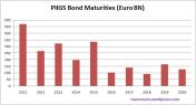 This is a major factor contributing to the Eurozone stress that just won’t go away. SpiegelOnline charts show the PIIGS must redeem bonds totaling over Euro45o BN in 2011, of which, Euro 128.3BN are Spanish Bonds and Euro264.6 BN Italian Bonds. Looks like 2011 is shaping up to be the year of “rollover risk.”