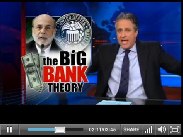 Hillarious video of Jon Stewart’s take down of Ben Bernanke’s 6o Minutes interview this past Sunday. Stewart referenced a 60 minutes interview in June 2009 where Chairman Bernanke said what the Fed was doing was “much more akin to printing money” when buying bank assets. In Sunday’s interview, Bernanke complained that “one myth that is out there, is we’re printing money. We’re not printing money.” Short Fed Cred!