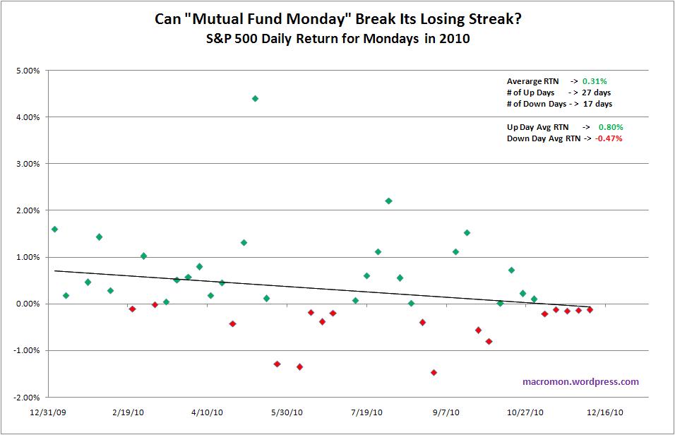 Not that MF Monday! Traders like to muse over the “Day of the Week Effect”, particularly, “Mutual Fund Monday”, where convention posits that since the crisis, the S&P5oo performs better on Mondays than other days. The thesis is that mutual funds tend to step-up purchases of stocks on Mondays, driving the day’s higher return.