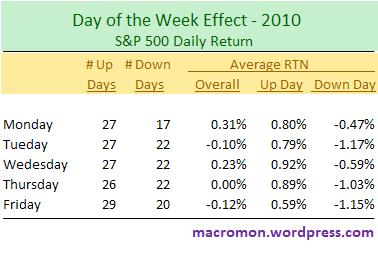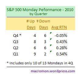 The average return on Mondays for the S&P5oo in 2010 is 0.31%, which is higher than other days of the week. The index has been up 61% of all Mondays in 2010, rising 27 and declining 17, which is the highest percentage day of the week. Generating only the third highest return on up days, trailing Wednesday and Thursday, Monday’s average loss on down days is significantly lower than others.