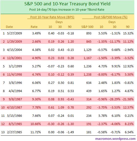 We have identified thirteen similar moves, where rates initially spiked 70 bps in 14 days and looked at how rates and the S&P 500 subsequently behaved 10/30/90 days after the move.
