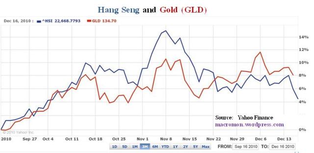 The Hang Seng and Gold ETF chart is quite stunning to us, not just how closely they have tracked on a directional basis over the past three months, but the fact they trade in different time zones. Even though the gold market basically trades around the clock, the Hang Seng index closes at 3:00 AM New York time, more six hours before the GLD opens for trading.