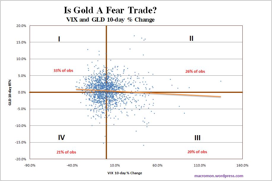 We looked at 10-day % changes in both the VIX and GLD and charted the observations on the scatter plot below. If gold were purely a fear trade, the two should consistently move together and the majority of the observations should be in Quadrant II & IV. This is not case, even for large moves in the VIX.