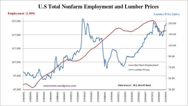 We wrote yesterday of the almost 50 percent increase in lumber prices since mid-June and how it bodes well for the U.S. labor market. We’ve constructed a cleaner chart to show how nonfarm employment moves with lumber.