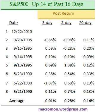 The S&P500 has traded up 14 of the past 16 days, which has happened only seven times in the past twenty-five years. Dismissing the streaks, it has only happened twice. Bespoke, who does great work and to whom we subscribe, beat us to the punch.