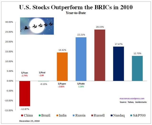 To the surprise of many, the U.S. stock indices are set to outperform those of the beloved BRICs in 2010. As of December 23rd, China and Brazil are down for the year with the Russian RTS the top performer, up 22 percent. India’s SENSEX is up 14.4 percent. The BRICs are struggling with inflationary issues, some, of which, are caused by massive capital inflows in search of higher yields.