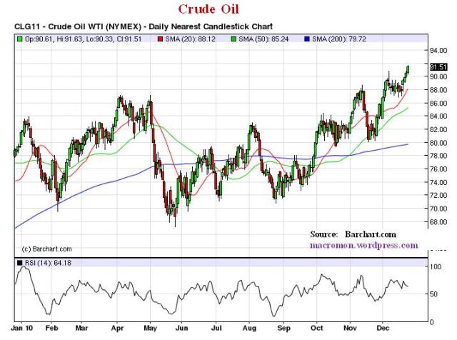 Crude Oil: After floundering for the first three quarters of the year, crude oil was the “catch-up” trade for Q4, rising over 15 percent since October 1 and is now up 16.2 percent year-to-date. There’s much chatter the market has internalized “peak oil” and crude is now driven mainly by these structural issues and less by cyclical forces. If the China demand story goes away for a few quarters as the tightening begins to slow the economy, and oil remains around the 90ish level, we’ll be converted. Otherwise, we’ll continue to channel our inner Jim Chanos and expect crude to take a hit here, which, by the way, we think will be spun as positive for U.S. markets.