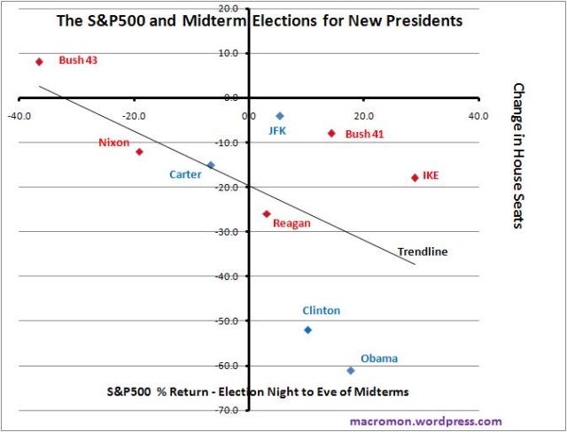 Prior stock market performance does not matter in the mid-term elections for first-term Presidents since Ike. In fact, the correlation to the number of Congressional seats won/lost by a sitting President was surprisingly negative. We emphasize correlation and not causation.