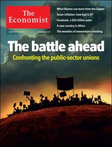 Take a look at the new cover of the Economist. We have been all over the coming “battle royal” between the state and local governments and their public sector unions, but not as much as Mike Shedlock over at the Global Economic Trend Analysis blog. We love teachers, fighter fighters, policemen, and all productive public servants, but think they are being led over the cliff by their unions.