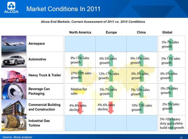 Alcoa kicked off earnings season tonight and beat both EPS and revenue expectations. Shares slid a bit in after hours, hour. Management presented this interesting chart on the conference call, which illustrates their 2011 expectation in both sectors and regions. Note the growth in North American trucking. Alcoa CEO, Klaus Kleinfiled had this to say,