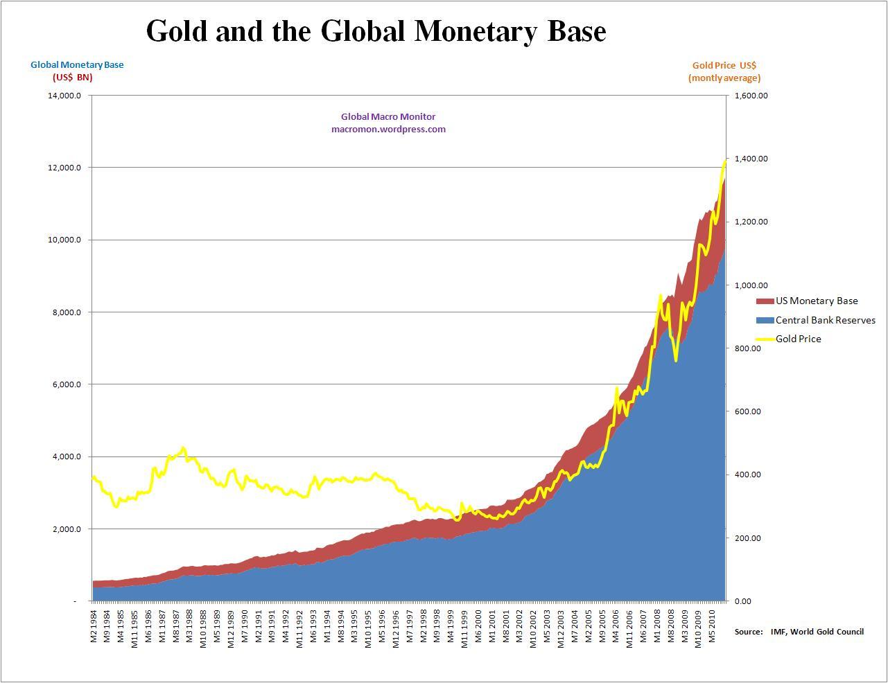 We calculate the “global monetary base” as the sum of central bank reserves less gold and the U.S. monetary base. Notice, the gold price broke out in late 2003 along with every other commodity and asset, including housing prices.