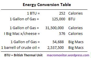The energy component of a Big Mac without cheese, for example, is 576 calories, so one gallon of gasoline is the energy equivalent of 54,688 Big Macs.  Still with us?