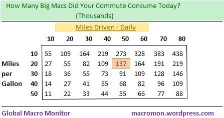 We’ve included the following table/matrix to show that if you drove 50 miles today in a car that gets 20 miles per gallon, you consumed the energy equivalent of 137K Big Macs.  Yuck!