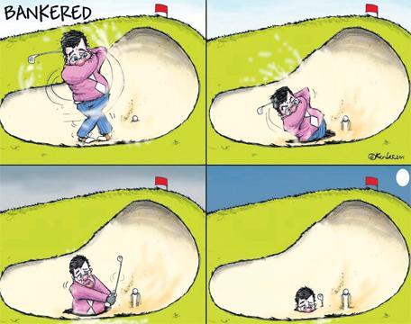Irish Prime Minister, Brian Cowan, is under fire for playing golf with Seán FitzPatrick, former CEO of Anglo Irish Bank — “the dynamo behind the breathtaking rise and spectacular crash of Anglo Irish Bank, is arguably the country’s most loathed and least trusted individual.” The cartoon appeared alongside this article/opinion in today’s Irish Independent. Sounds like the elections may be delayed until April.