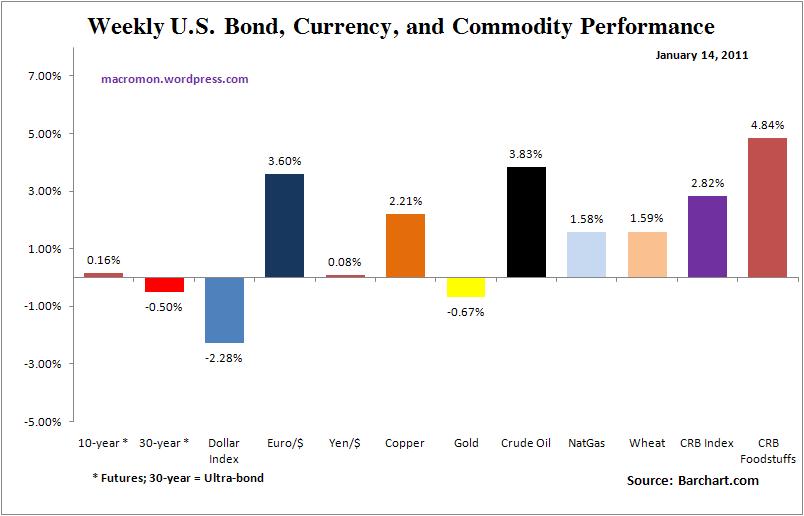 The Euro rose 3.60 percent against the dollar as the ECB President put the big hurt on the shorts. The Dollar index gave up its gains from the prior week and is now flat for year. Crude oil rose 3.83 percent and the CRB foodstuffs sub-index spiked 4.84 percent. The sharp rise in food price is sparking riots across North Africa. The sharp rise in food prices will improve the U.S. terms of trade and should bolster the dollar, in our opinion.