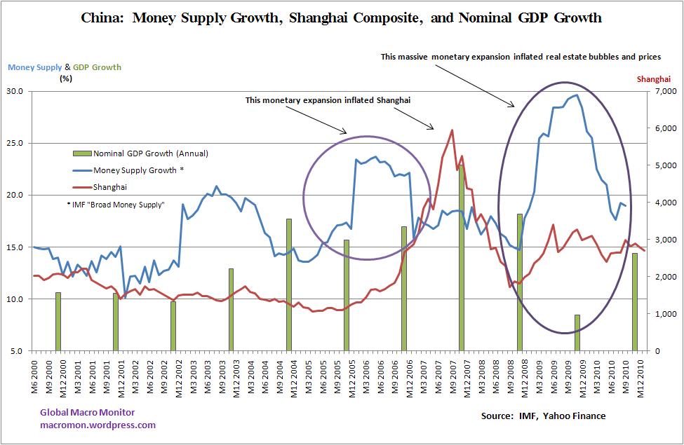 The chart illustrates as nominal GDP growth was collapsing in 2009, the broad money supply in China was growing close to 30 percent by the end of 2009. This helped the Shanghai Composite recover a bit, but inflated other bubbles, including and mainly in the real estate markets. We hear rumors of, and see pictures of empty Chinese shopping malls and cities pinging around the internet, which is the result of the easy and nonmarket credit included in the latest round of China’s monetary expansion.