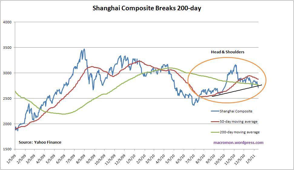 Last night the Shanghai Composite broke key support of the 200-day moving average and the neckline of a technical head and shoulders (H&S) pattern. The chart below shows the price point of the current break is lower than the penetration of the 200-day in late December, which is reflective of the short-term downtrend. The next key support level is 2, 600.