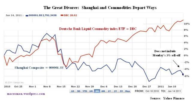Recent price action exhibits all the characteristics of a blow-off top and some of the leaders already seem to be trading at stall speed. Furthermore, as the chart below illustrates, since November the Shanghai and commodities, which have in the past tracked each other relatively well, are in a huge Willey E. Coyote divergence.
