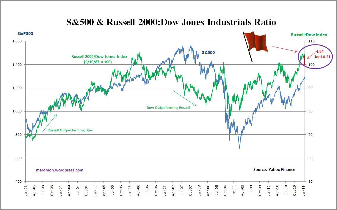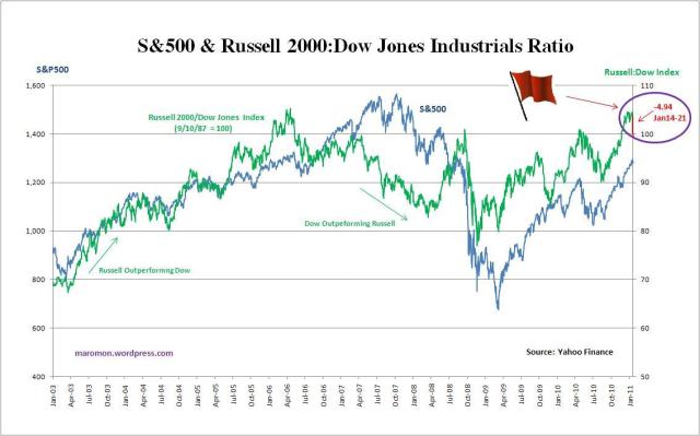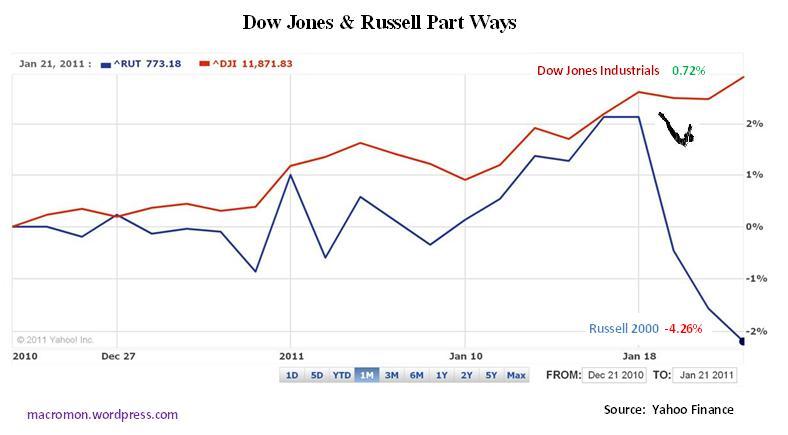 We suspect this just may be profit taking from the Russell’s huge run-up in 2010 as many of the stocks that were up big over the past year also got whacked during the week. The size of the divergence does raise a red flag, however.