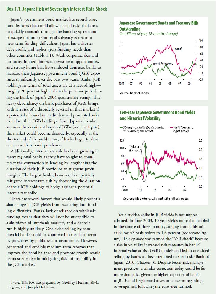 In the context of S&P’s recent sovereign downgrade of Japan we thought you’d be interested in this IMF piece published in October. The basic thesis is that Japanese commercial banks have been the main buyers of JGBs over past few years and are at risk of sovereign rate shock.