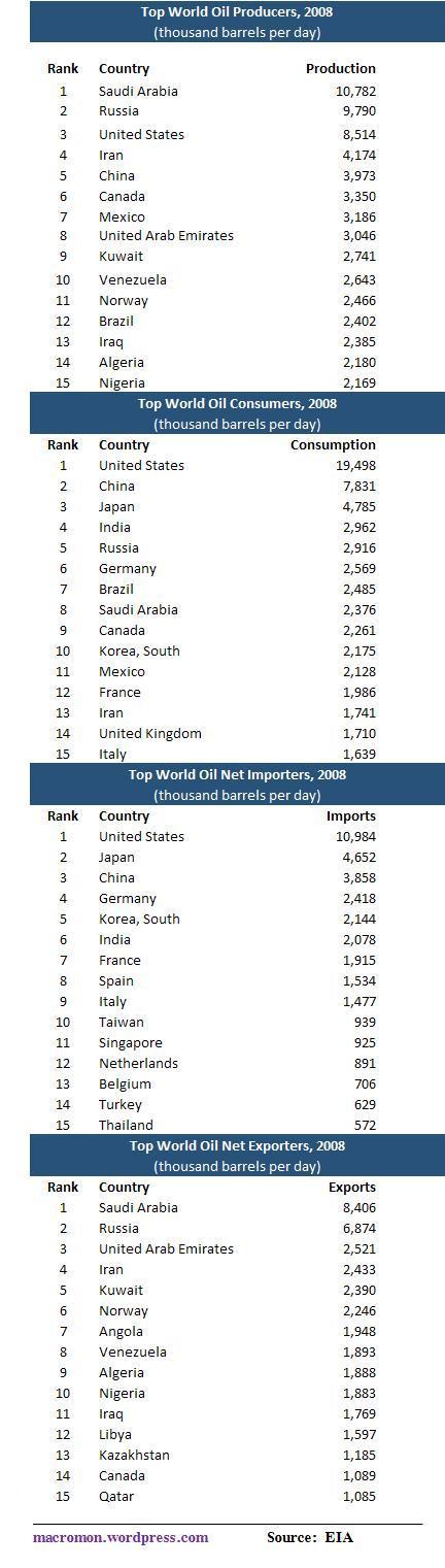 The following “Top 15 tables” from the E.I.A. provide a comprehensive geopolitical perspective of the crude oil market. You can see who is benefiting and who is taking pain from the increase in crude oil prices. The data are from 2008 but the ranks probably haven’t changed much. (click here if table is not observable)