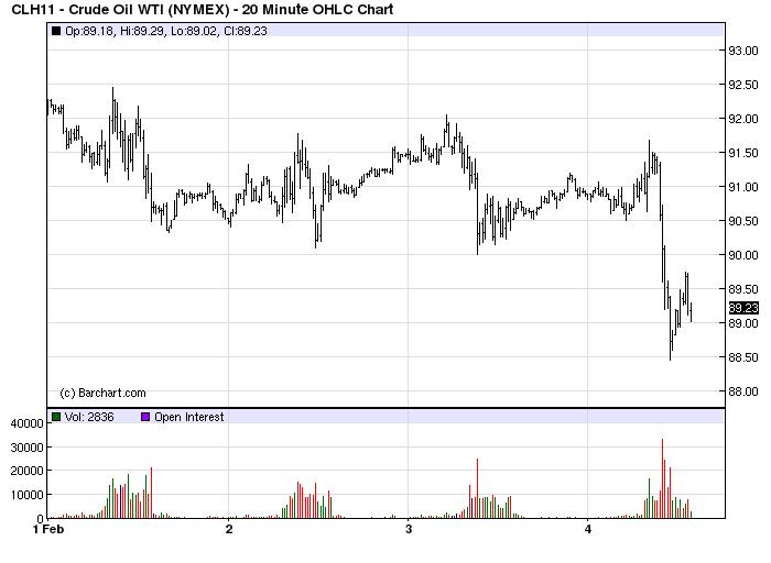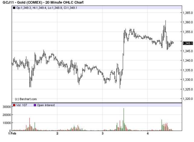 The crude and gold market are certainly trading as if Mubarak will be out before the weekend is over. We heard an oil trader say that if democracy breaks out in Egypt, i.e., Mubarak is forced out, it would be positive for oil as instability would increase throughout the region.