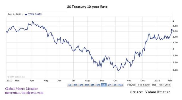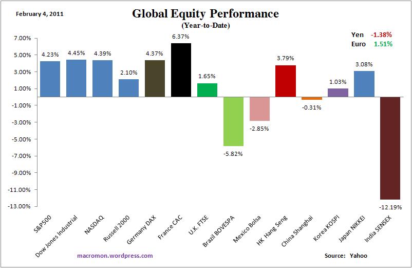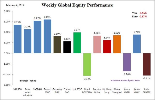 The key issues for next week:  1) the Bank of England’s decision on monetary policy, where economists now think there is a 33 percent probability of a rate hike, and how markets react if they do hike rates; 2) How the markets and Chinese workers behave after the return from Lunar New Year holiday;  and 3) Ron Paul’s first hearing as Chairman  of the Domestic Monetary Policy and Technology Subcommittee on Wednesday;  and 4) long-term U.S. bond rates;  and 5) Bank of Korea on Friday.   Have a great week!