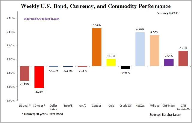 The ECB dismissed rumors of an imminent hike  in rates and it now looks like their tough talk on inflation was mainly designed to squeeze the Euro shorts.  We may see some follow through selling in the Euro this week.  Are the Eurozone countries going to agree to a more uniform retirement age?  We restate our position that there is an abundance of short-term liquidity in Europe, but a shortage of political unanimity and the potential for adjustment fatigue.    We just witnessed in Egypt how politics can at times be just as unpredictable, volatile, and unstable as markets.