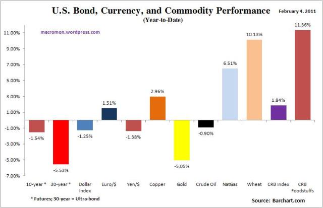 The dollar was relatively flat and copper, natural gas, and the foods had good moves.  The CRB foodstuffs sub-index and wheat prices are now up over 10 percent for the year.  Full blown panic buying and hoarding is driving the market and we expect a G20 crackdown on speculation in the next few months.  The EU just released their report on the financialization of commodities and the future exchanges are increasing margin requirements.