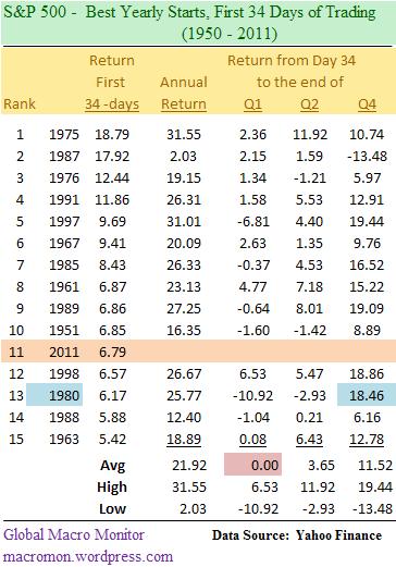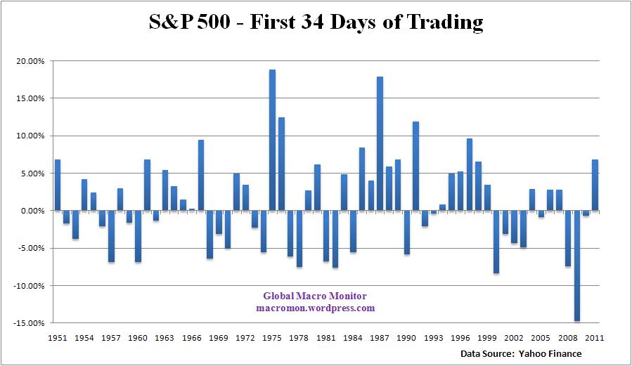 The S&P 500 is off to its best start of the year since 1997 and ranks 11th with respect to the highest return for the first 34 days of trading in all years from 1950-2011. This is, surprisingly, only the fourth year since the start of the new millennium where the index has had a positive return in the first 34 days of trading.