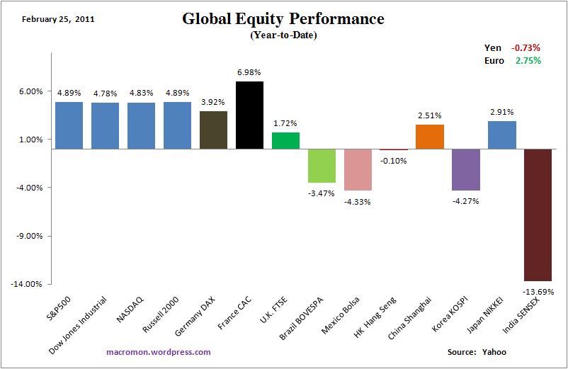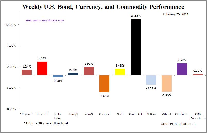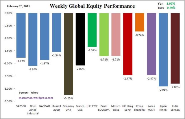 The past week was all about oil with West Texas up over 13 percent on fears of political instability spreading into Saudi Arabia.   Every major stock market we monitor in the Week in Review was down with the German DAX taking the biggest hit, falling 3.25 percent and the Shanghai down the least, 0.74 percent.