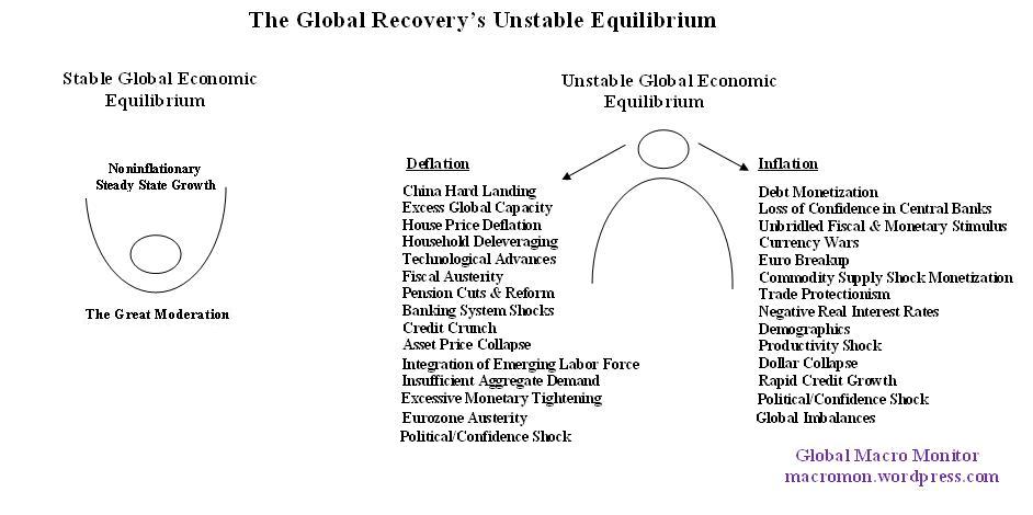 We’ve put together this nice little graphic which reflects our view the global economy is in a very unstable equilibrium and list many of the issues and headwinds it faces. Global economic growth, based on monetary or credit induced asset inflation, exchange rate manipulation, perpetual stimulus and negative real interest rates straddles a tight wire and very narrow path with inflation on one side and deflation on the other. By default, stagflation then becomes almost the steady state economic growth path.