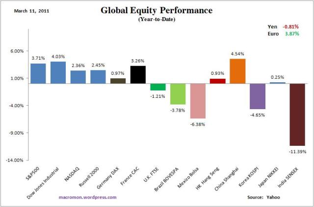 We don’t have much to say in a week that ended with the terrible tragedy in Japan. Every major equity market we track was down with the Nikkei not surprisingly performing the worst and will no doubt open down big Monday morning. The European indices broke their 50-day moving averages and the Dow and S&P500 are the only two we track still above their 50-days after their impressive ability to rally into Friday’s close.