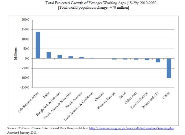 Only sub-Saharan Africa stands to see an appreciable growth in youth manpower. In fact, the sub-Sahara will account for over 100% of total growth in the world‘s 15-29 population, because many regions will find their pools of young manpower shrinking over the next two decades. Japan and Europe as a whole are both on course for significant absolute declines in this key manpower pool over the next 20 years (prospective drops of almost 25%). But by far the most massive falloff in young manpower is set to take place in China. Over the next 20 years, by the Census Bureau‘s projections, this key working age group will be falling in China by fully 100 million persons—or over 30 percent.