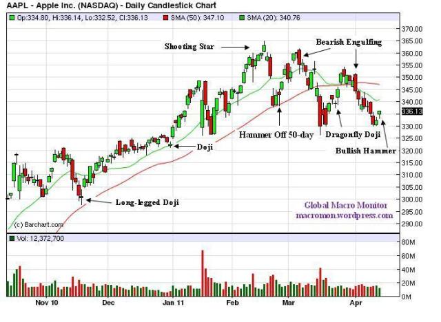 First a disclaimer.  You know our confirmation bias on Apple. We think it is the best company in the world, the Five Star General of this bull market, and the leader in the new wireless/app driven global economy.  We recognize we’re prone to seeing bullish signals for Apple in cloud patterns if we stare at them long enough.   But,  we’ve traded a fair share of the stock and have noticed, illustrated in the chart, that certain candlestick patterns often signal a big move.