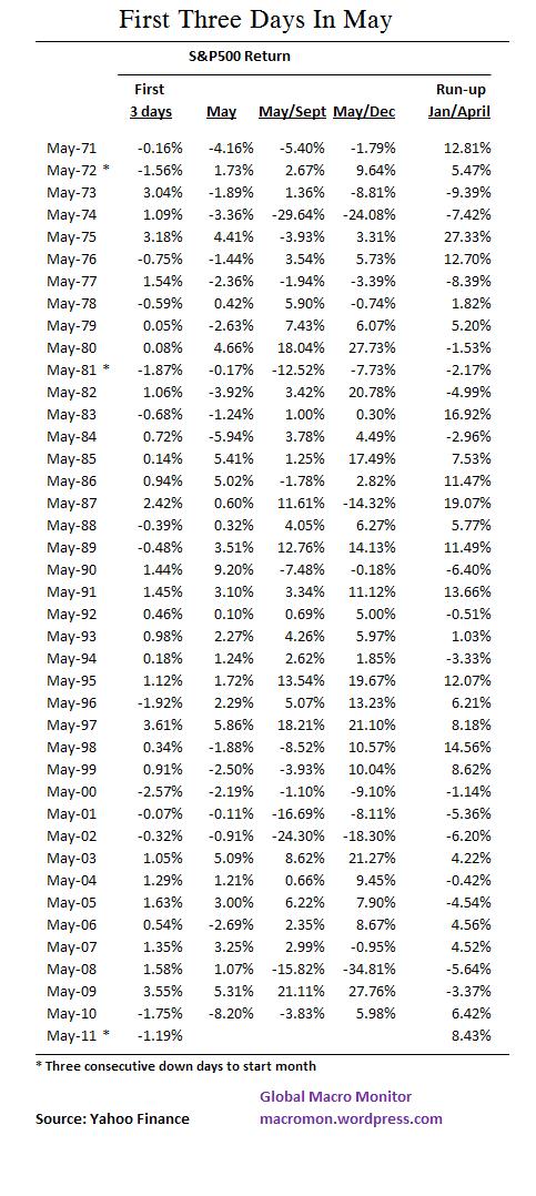 The equity market has made a little bit history in the first three days in May. Only four other times in the last fifty years has the S&p500 opened May with three consecutive down days.
