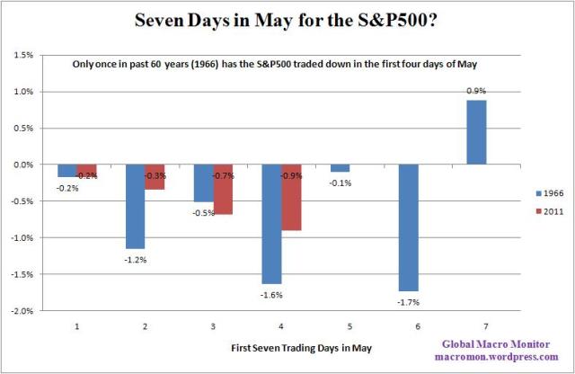 We noted last night only four other times in the past fifty years has the S&P500 opened May with three consecutive down days. We find this type analysis great cocktail chat, at best interesting, but not very actionable. Nevertheless, today’s S&P decline narrows the field to only one other time since 1950 (the beginning of our times series) has the S&P500 traded down in the first four days of the month of May. The chart below shows that in 1966 the S&P declined in the first six days of May. Seven Days in May?