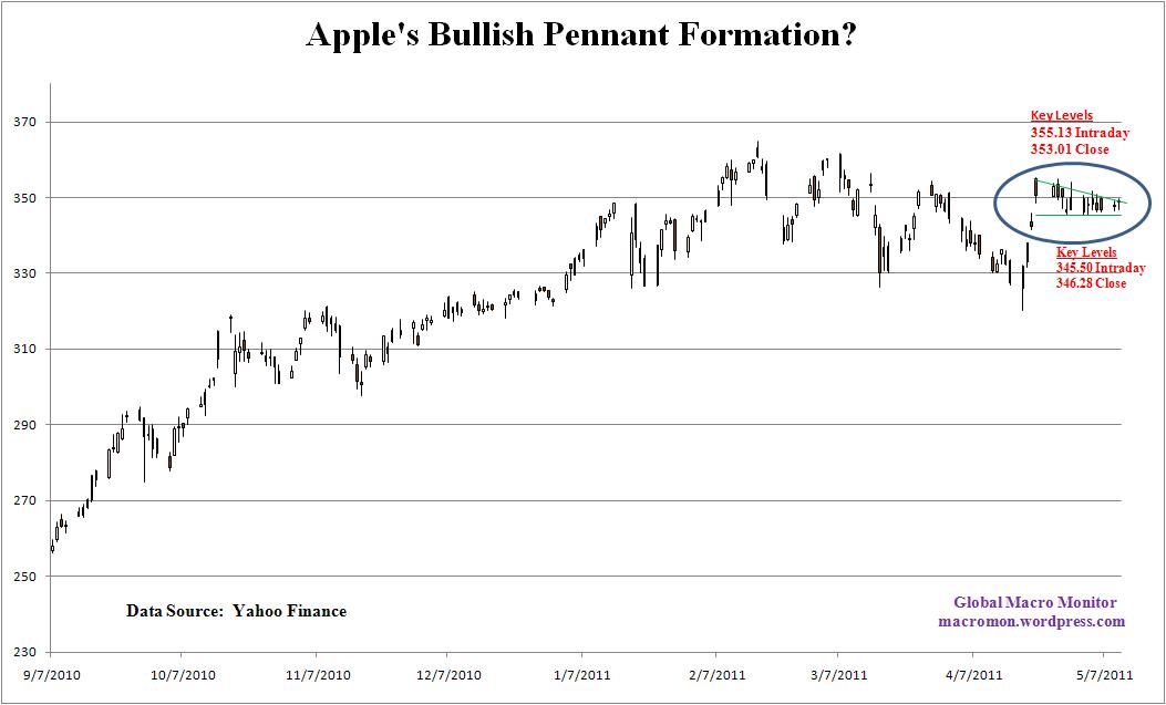 After trading sloppy all day Apple caught a nice bid into today’s close. The stock is forming a classic pennant pattern and a close above 353.01 would be a bullish signal the stock is ready to break to new highs. A close below 346.28 is bearish. This is an important stock at an important time in the market and warrants close monitoring. (click here if chart is not observable)