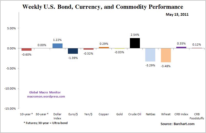 The key question for markets this week is how will they react to the Dominique Strauss-Kahn (DSK) news? Will the Dollar continue to strengthen keeping the “risk off” (we hate that simplicity) trade on? Are traders of the European periphery going to hit the panic button? Will this scandal cause the markets to snowball into a full blown flight to quality trade? (click here if charts are not observable)