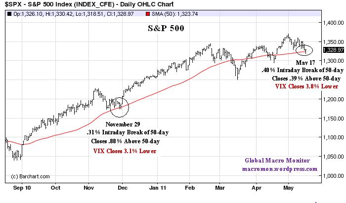 Today the S&P 500 traded through its 50-day by 0.40 percent and closed 0.39 percent above the 50-day.   The VIX fell 3.8 percent on the day.   We doubt the S&P is done with the 50-day and ready to rally likes its  Novie 29.   Recall,  QE2 was just launching back then and is now ready for the dry dock.